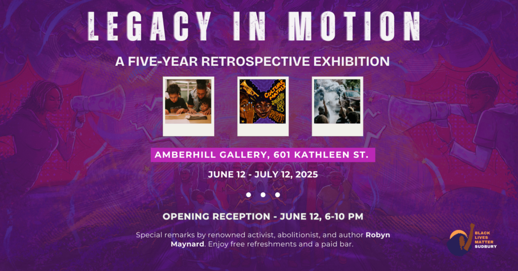 We are proud to announce Legacy In Motion: A Five-Year Retrospective, a special exhibition honouring the powerful work and impact of Black Lives Matter – Sudbury over the past five years. Hosted at Amberhill Gallery (601 Kathleen St.) from June 12 to July 12, 2025, the retrospective traces the movement’s local impact from grassroots resistance to the creation of vibrant Black cultural spaces and highlights the work of creatives and organizers who continue to shape the social and political landscape of the North.